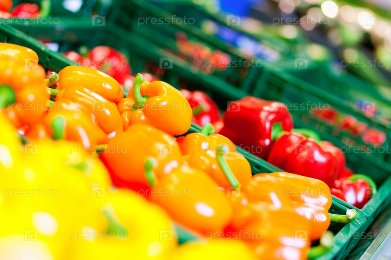 Оранжевые, желтые и красные перцы в супермаркете