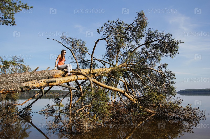 Девушка сидит на поваленном дереве