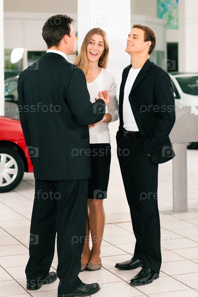 Молодая пара в автосалоне желает купить машину