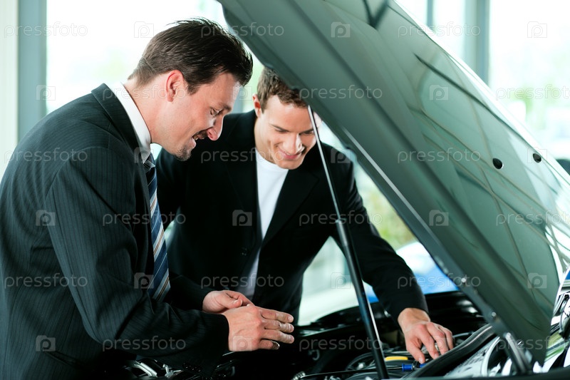 Продавец и покупатель осматривают машину под капотом