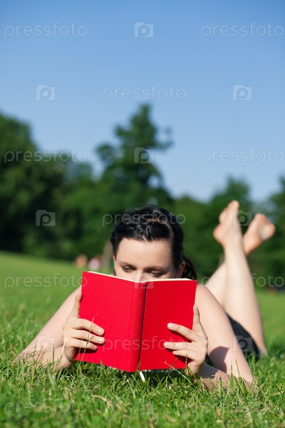 Девушка лежит и читает книгу в парке
