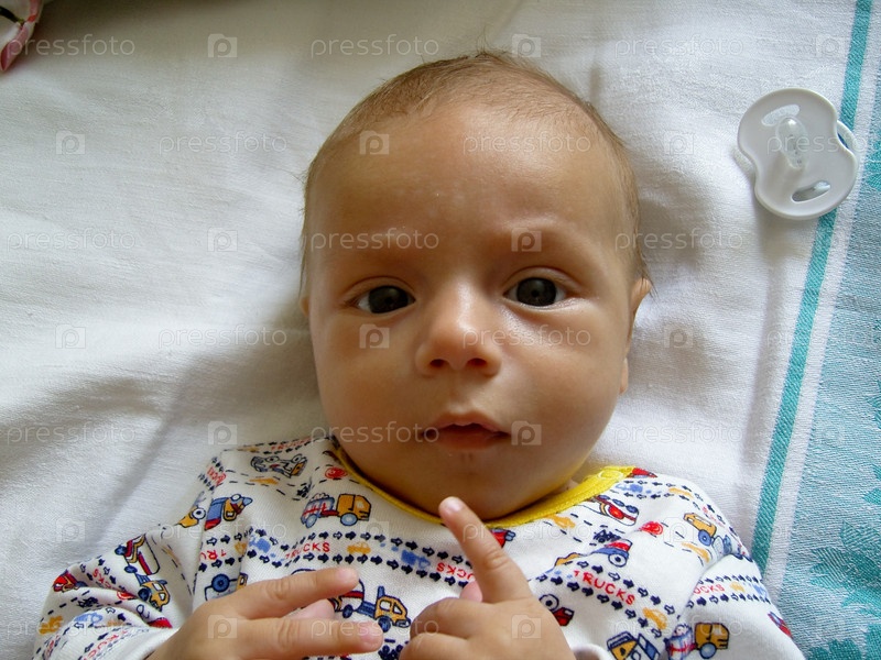 Младенец лежит на спине и смотрит в камеру