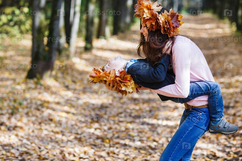 Мать с сыном играют в осеннем парке