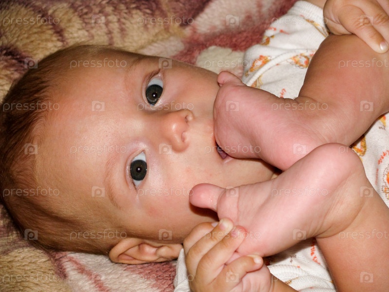Младенец кусает себя за ножку