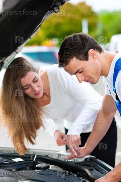 Девушка и мастер смотрят под капот машины