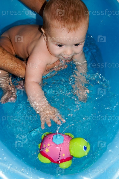 Маленького ребенка купают в ванночке