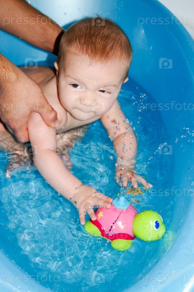 Маленького ребенка купают в ванночке