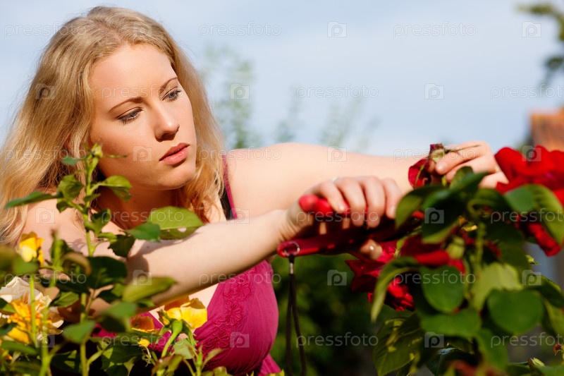 Красивая блондинка подстригает розовый куст садовыми ножницами