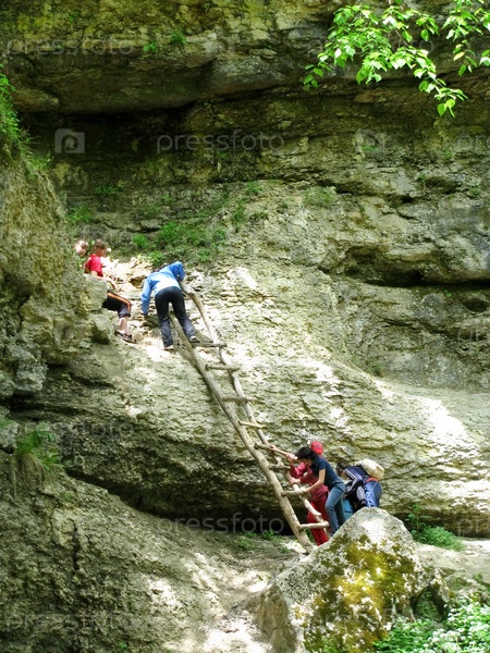 Туристы взбираются по лестнице в пещеру