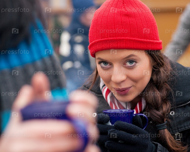 Женщина в теплой одежде с кружкой в руках