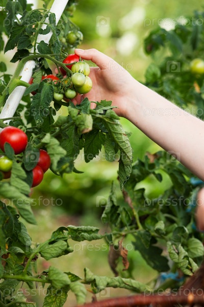 Рука срывает красный помидор с куста на фоне зелени