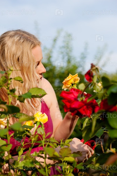 Блондинка срезает стебель розы садовыми ножницами