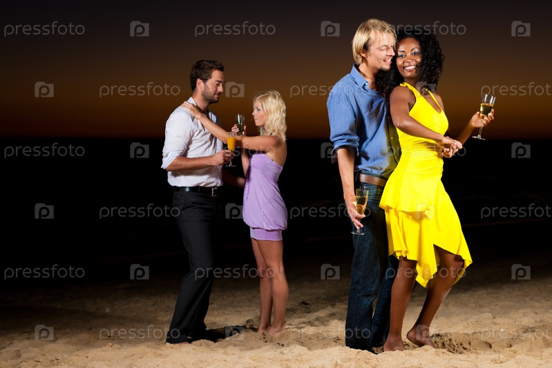 Молодые люди на пляже с наполненными бокалами