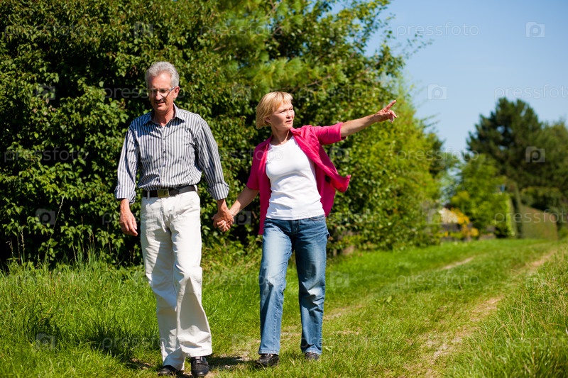 Пожилая пара гуляет в летнем парке