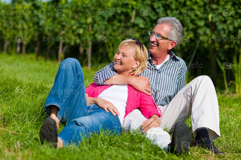 Счастливая пожилая пара отдыхает на зеленой траве