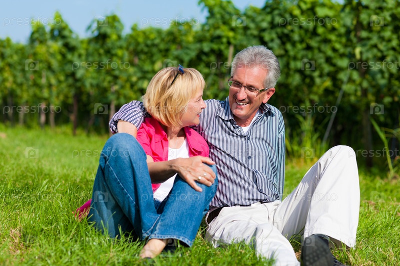 Счастливая пожилая пара отдыхает на зеленой траве