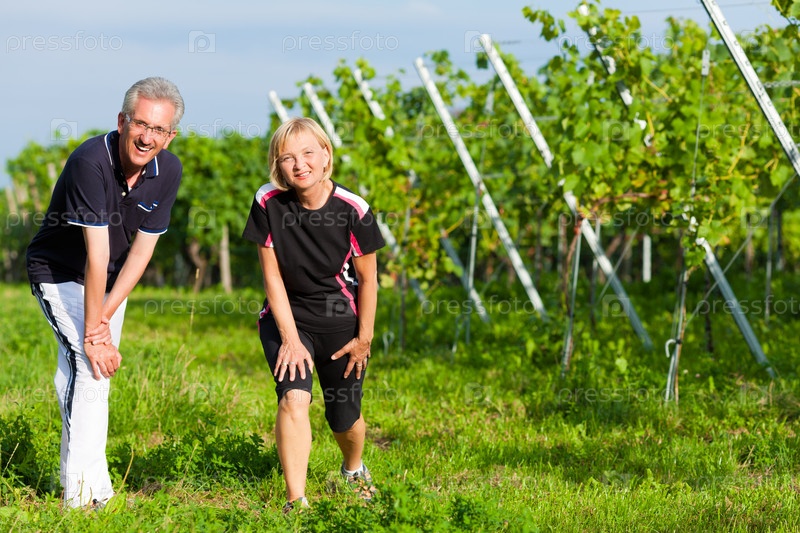 Счастливая пожилая пара тренируется в летнем саду