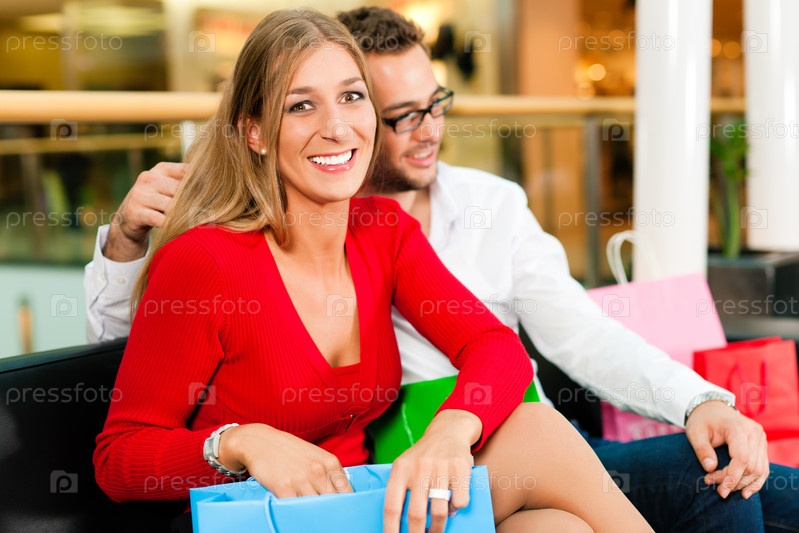 Молодая пара, сидящая с покупками на диване в торговом центре