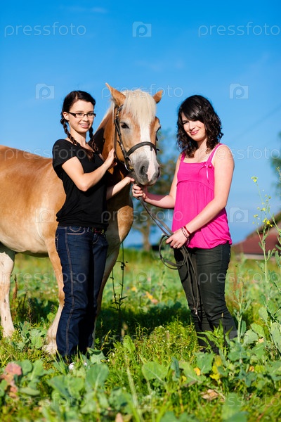 Две девушки с лошадью в парке