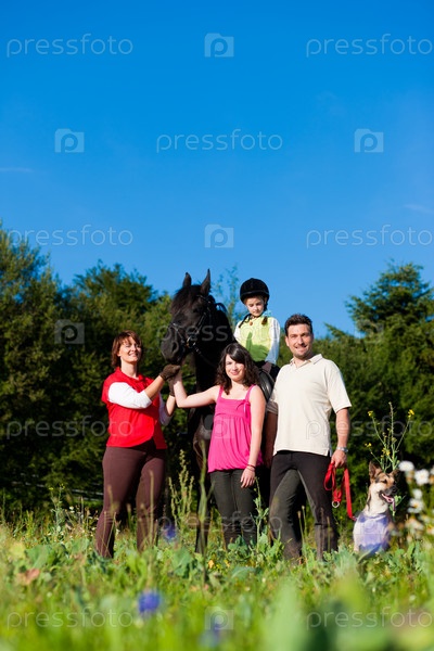 Семья из четырех человек с лошадью и собакой в летнем парке