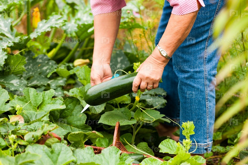 Садовод срезает кабачок с грядки в саду