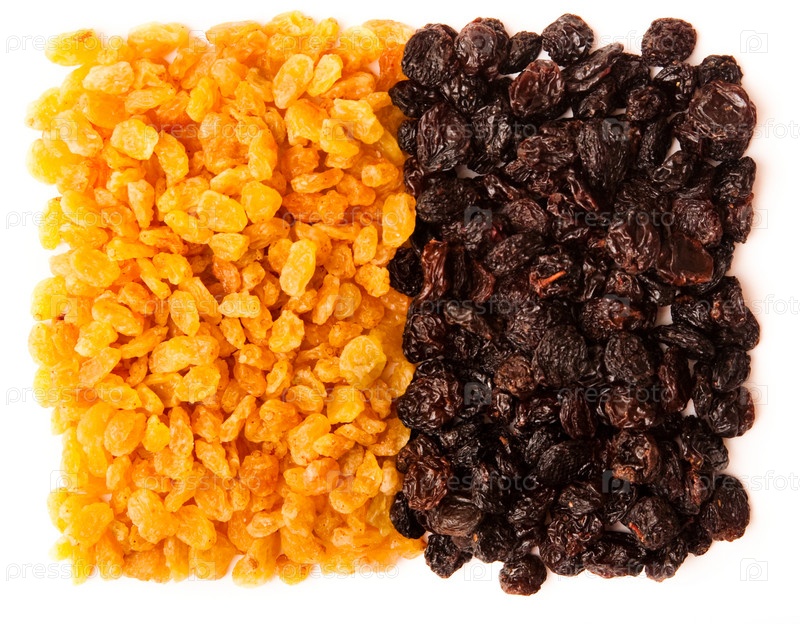 Черный и желтый изюм на белом фоне