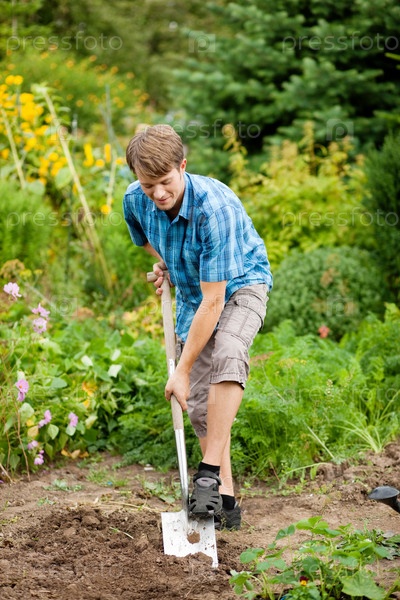 Парень с лопатой в руках копает землю в саду