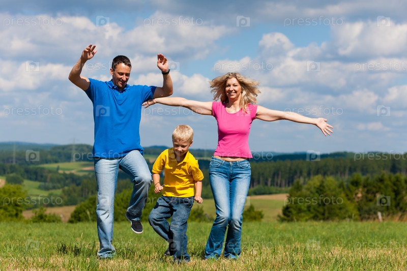 Счастливая семья из трех человек отдыхает на природе