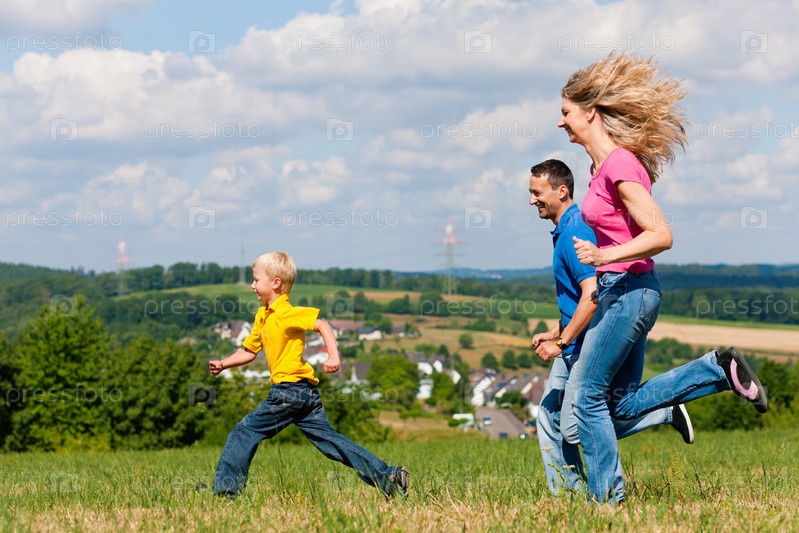 Счастливая семья из трех человек бежит по лугу