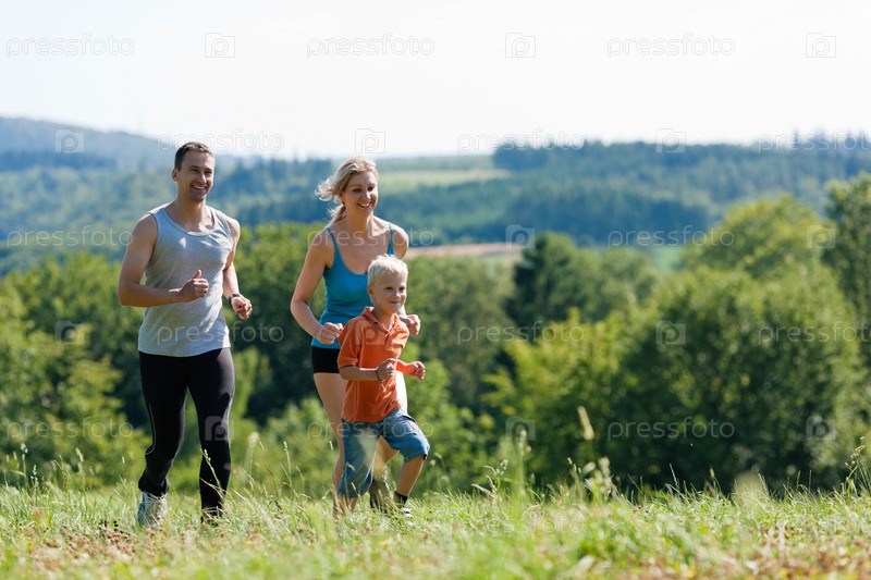 Счастливая семья из трех человек бежит по лугу