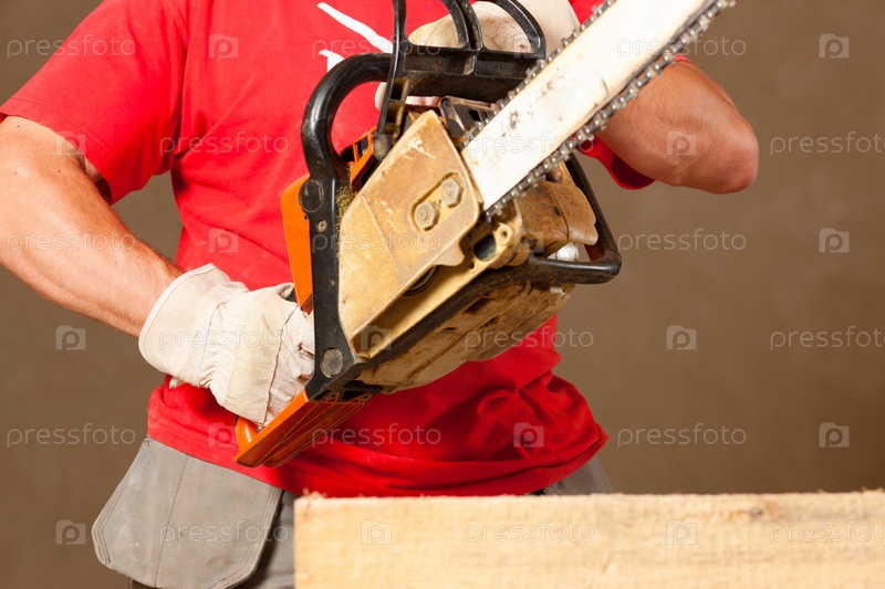 Мужчина держит бензопилу над доской