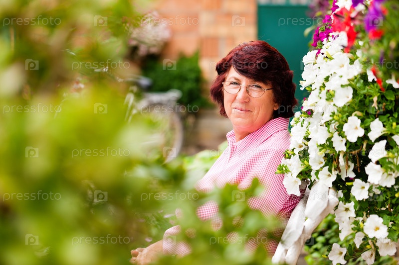 Пожилая женщина в цветущем саду