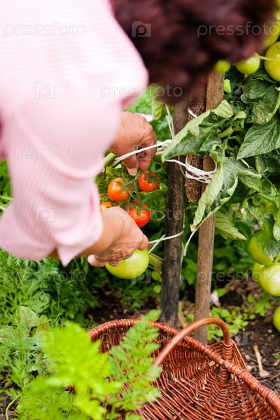 Пожилая женщина собирает спелые помидоры в саду