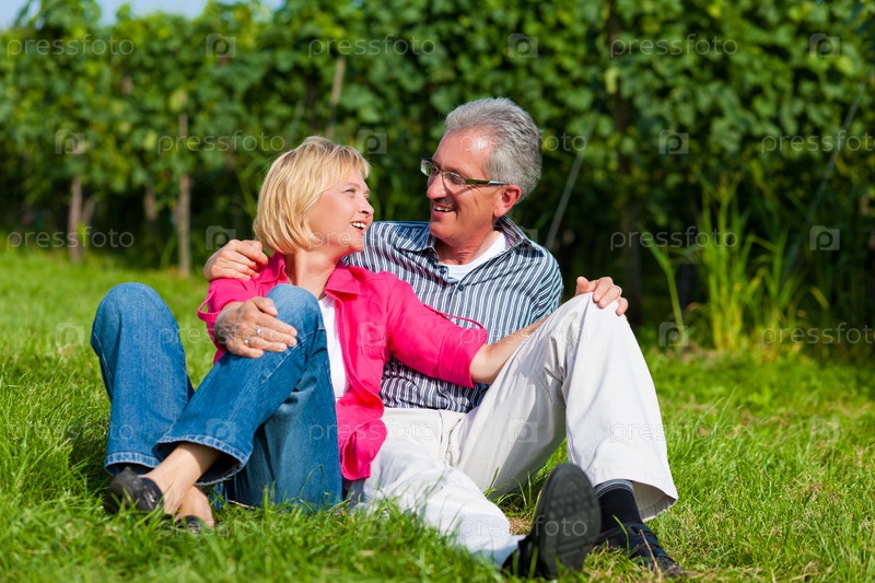 Пожилая пара отдыхает на зеленой лужайке
