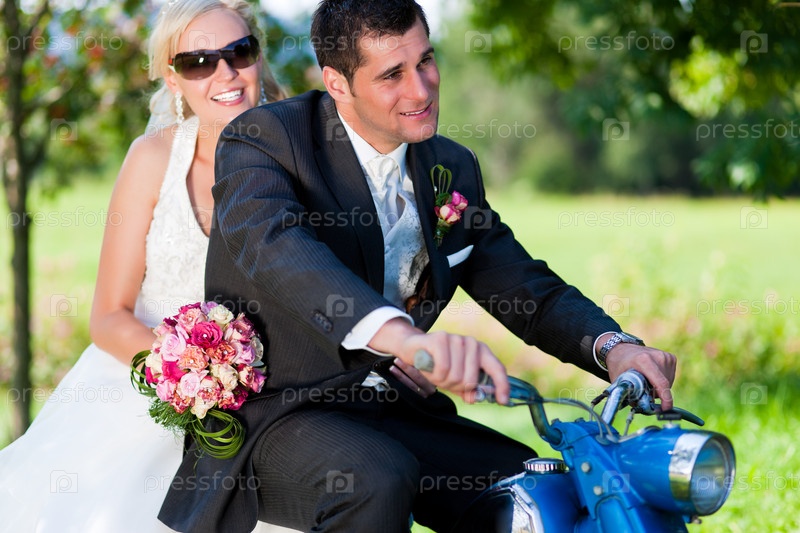Счастливые молодожены едут на мопеде на фоне зелени