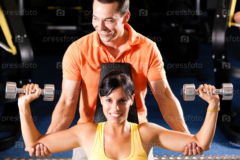 Мужчина поддерживает за руки женщину,которая держит гантели