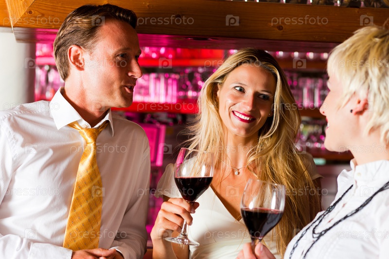 Мужчина и две женщины с бокалами красного вина общаются в баре