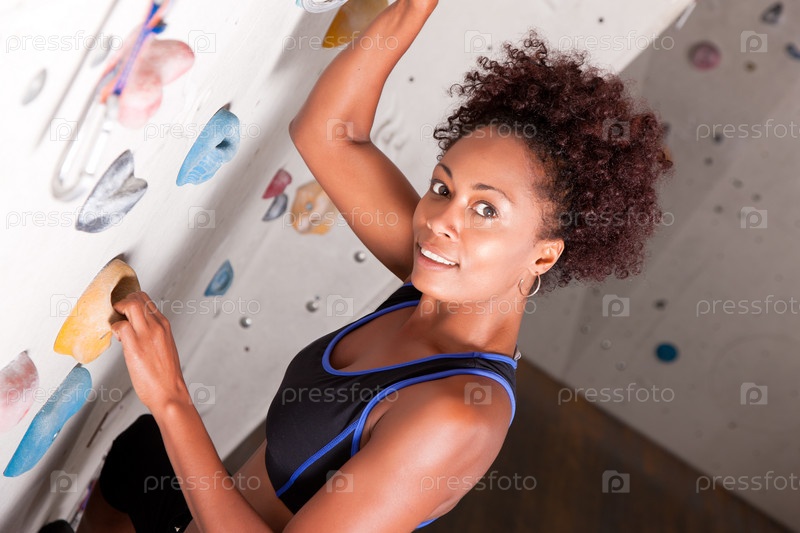 Темнокожая женщина ,поднимается по отвесной стене с искусственными уступами