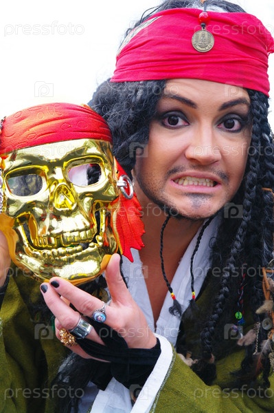 Актер в образе Джека Воробья с пиратской маской на парусном корабле Кастор-1, Москва