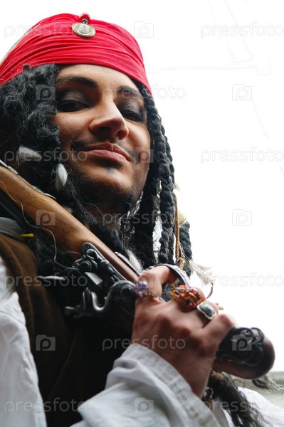 Актер в образе Джека Воробья с мушкетом на парусном корабле Кастор-1, Москва