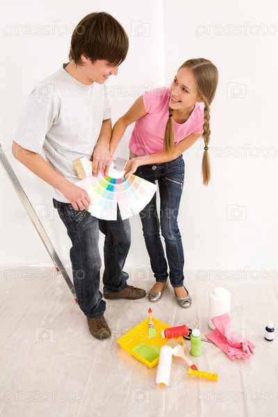 Молодая счастливая пара выбирает цвет в палитре в новом доме