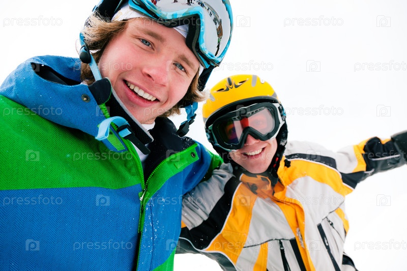 Счастливые улыбающиеся горнолыжники на белом фоне