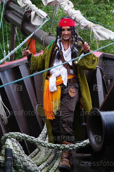 Актер в образе Джека Воробья на носу парусного корабля Кастор-1, на фоне листвы деревьев, Москва