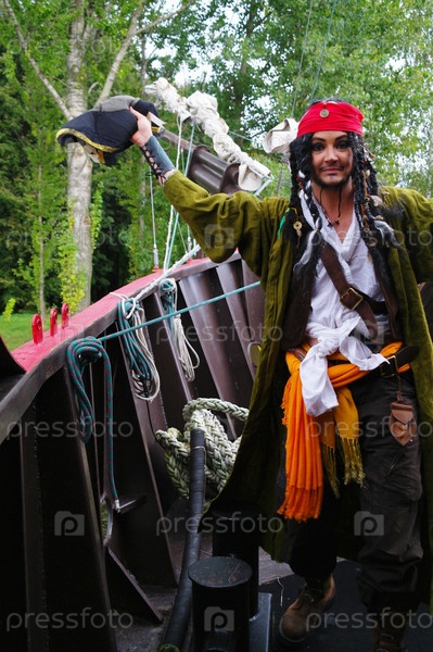 Актер в образе Джека Воробья на носу парусного корабля Кастор-1, на фоне листвы деревьев, Москва