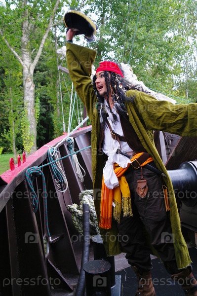 Актер в образе Джека Воробья на носу парусного корабля Кастор-1, на фоне листвы деревьев, Москва