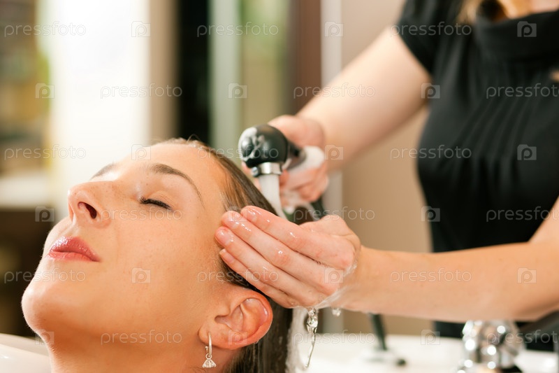 Парикмахер моет клиенте волосы