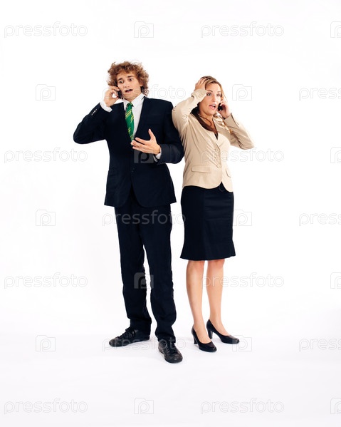 Бизнесмен и бизнес леди разговаривают по телефону