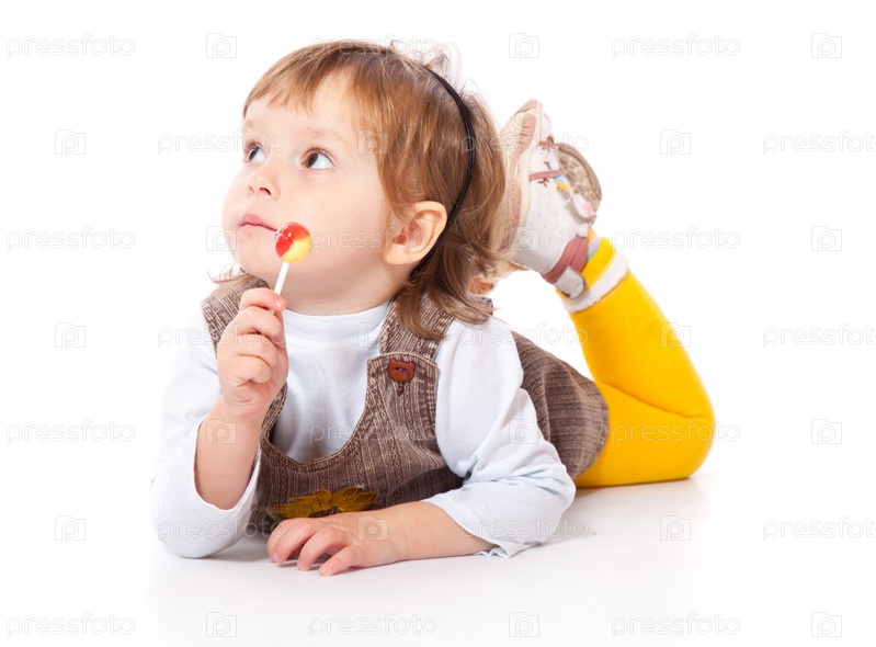 Счастливый ребенок улыбается с конфетой. Изолированный на белом фоне