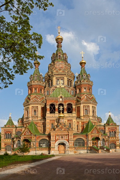 Красивые старая церковь на фоне голубого неба, Петергоф, Россия