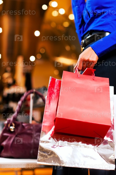 Рука девушки с пакетами в магазине